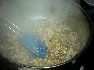 Place the quinoa in a large, dry saucepan over medium heat. Toast the quinoa until fragrant, about 5 minutes, stirring frequently. Place the quinoa in a bowl and set aside.